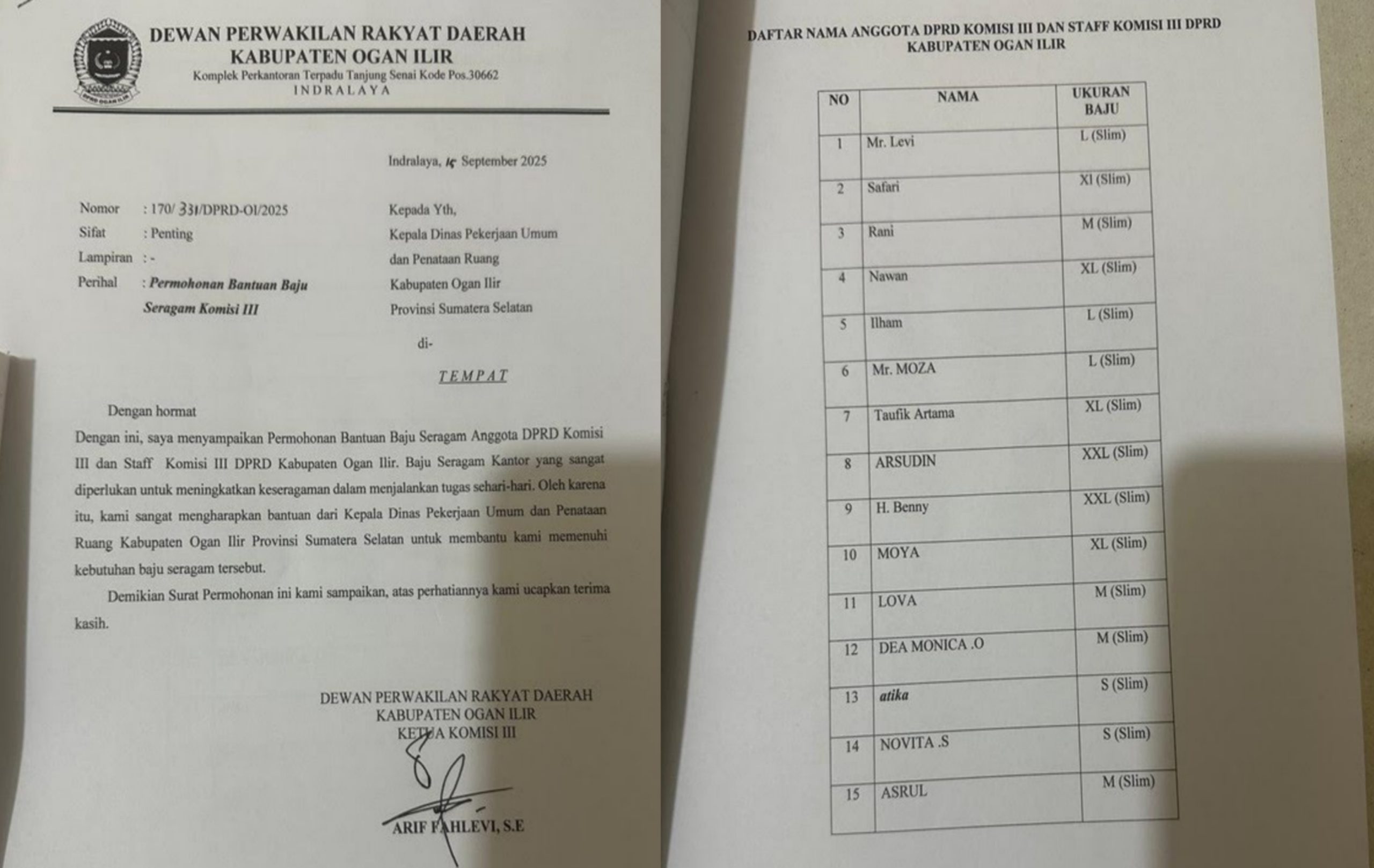 Surat permohonan yang viral itu dikirim Komisi III DPRD Ogan Ilir ke Dinas PUPR. Tanggalnya? Senin, 15 September 2025. Tertanda tangan Ketua Komisi III, Arif Fahlevi. Isinya bak nota lucu tapi serius: minta OPD “membantu memenuhi kebutuhan baju seragam”.